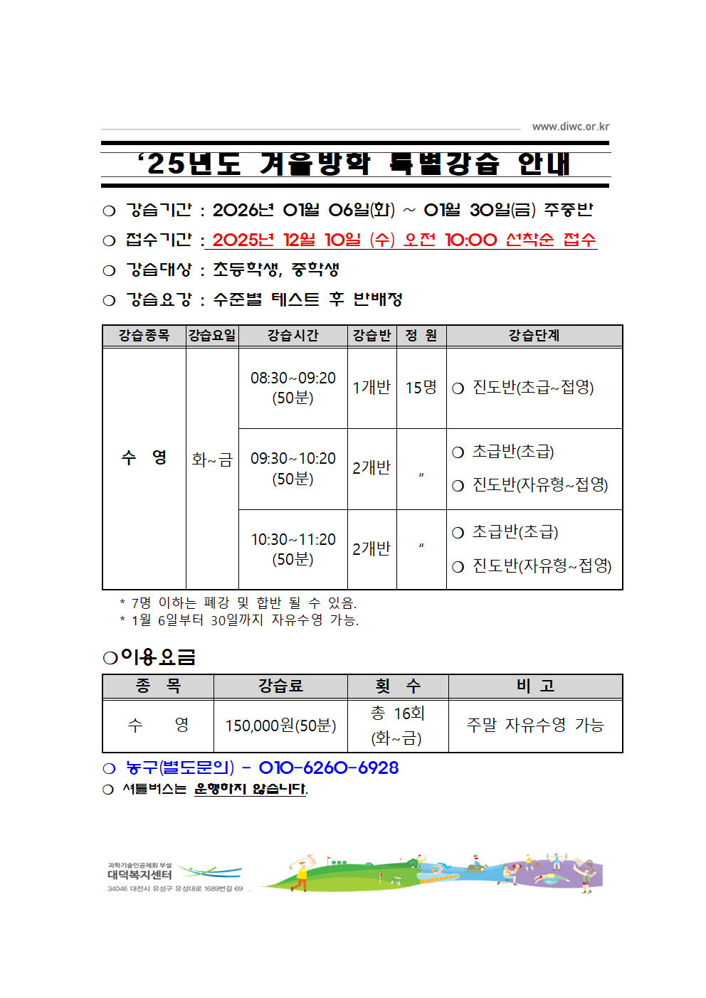 공지사항 공지사항의 작성자, 작성일, 조회수, 내용의 항목에 관한 표입니다. [도룡스포츠센터] 2025년 겨울방학 특별강습 안내 작성자도룡스포츠센터 작성일2025-11-27 조회수289 겨울방학특강.png(92.7 KB) 목록