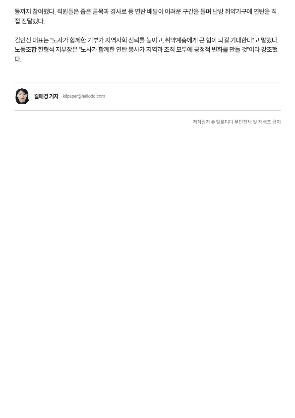 공지사항 공지사항의 작성자, 작성일, 조회수, 내용의 항목에 관한 표입니다. [보도자료] 대덕복지센터 이웃 사랑, 연탄 3천장 구입해 직접 배달까지 작성자총괄관리자 작성일2025-12-01 조회수99 목록