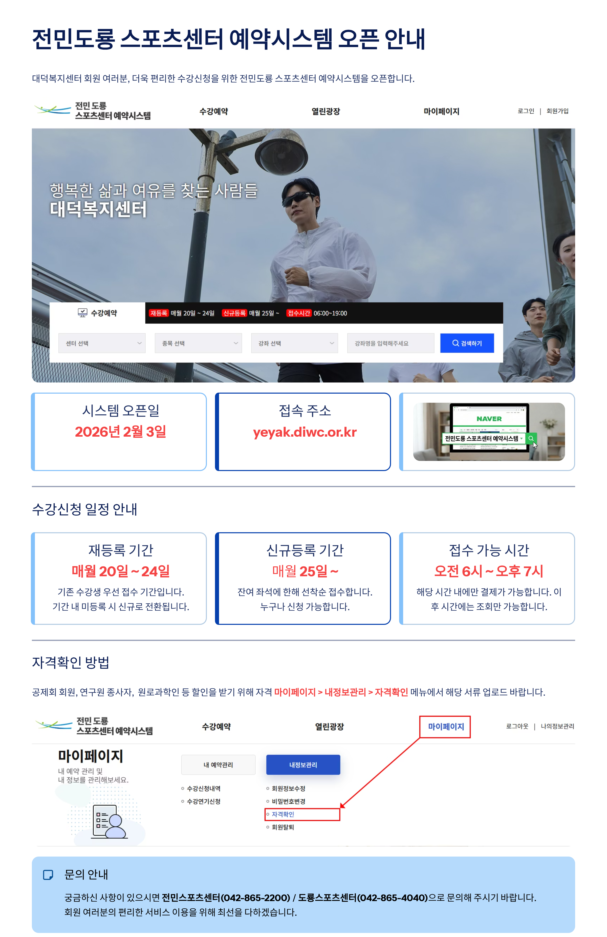 공지사항 공지사항의 작성자, 작성일, 조회수, 내용의 항목에 관한 표입니다. [대덕복지센터] 전민도룡 스포츠센터 등록시스템 오픈 안내 작성자총괄관리자 작성일2026-01-21 조회수216 전민도룡_스포츠센터_예약시스템_오픈_안내.png(2.1 MB) 목록