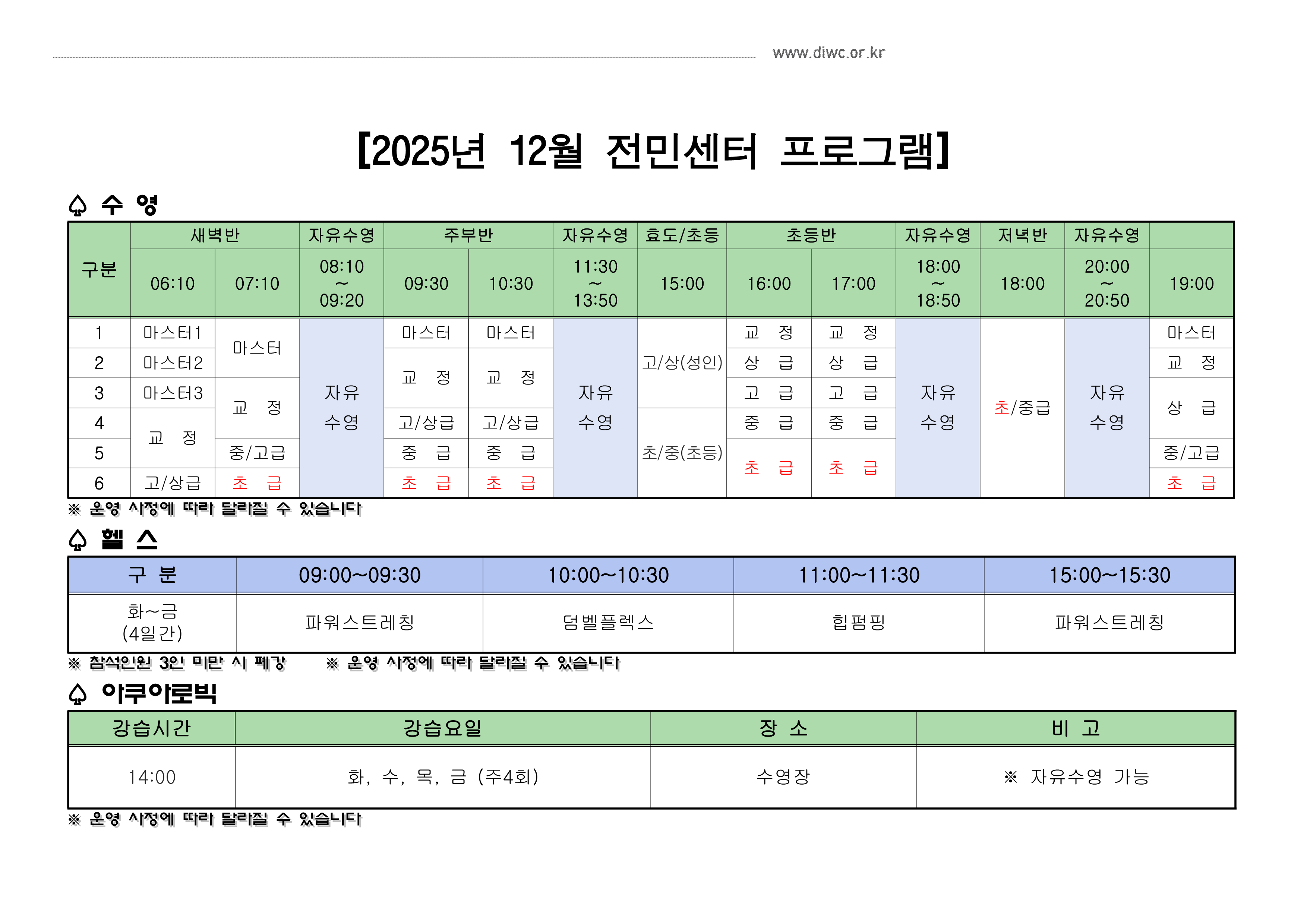 공지사항 공지사항의 작성자, 작성일, 조회수, 내용의 항목에 관한 표입니다. [전민스포츠센터] 전민스포츠센터 12월 강습 프로그램 안내 작성자전민스포츠센터 작성일2025-11-13 조회수732 다운로드.zip 2025__12월_강습프로그램_1.png(294.6 KB) 2025__12월_강습프로그램_2.png(229.7 KB) 목록