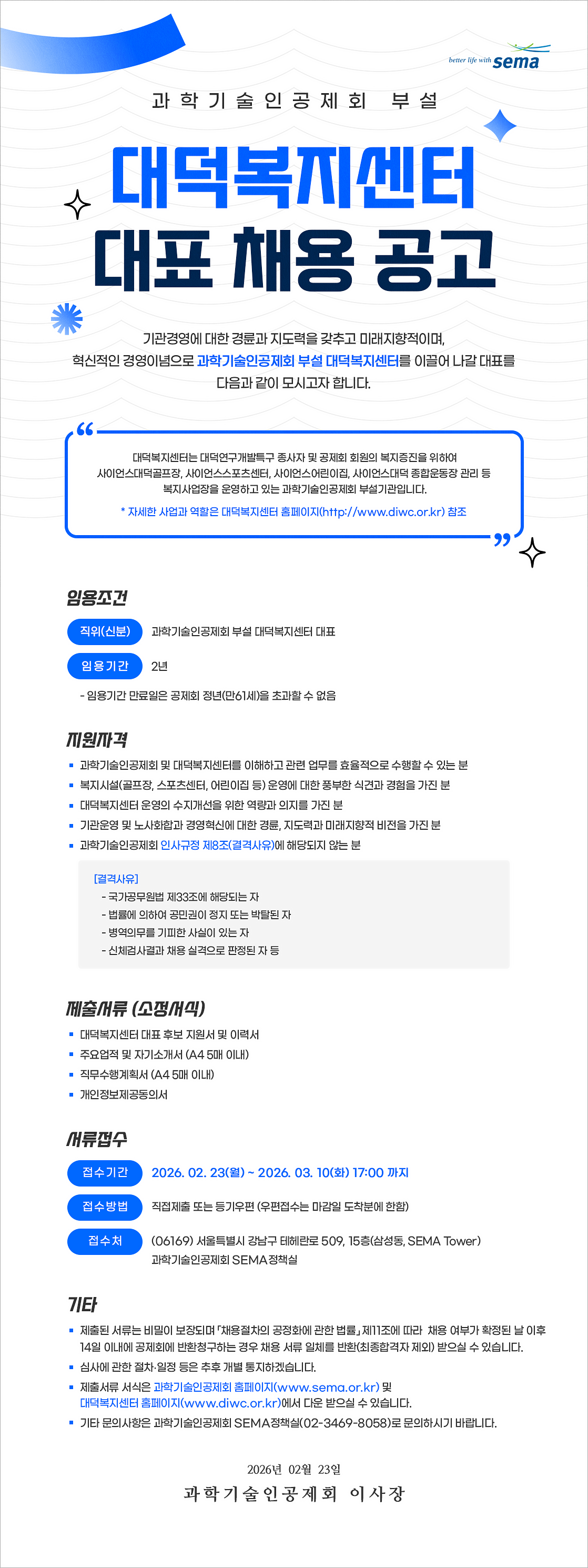공지사항 공지사항의 작성자, 작성일, 조회수, 내용의 항목에 관한 표입니다. [진행중] (채용공고) 대덕복지센터 대표 채용 공고 작성자총괄관리자 작성일2026-02-23 조회수123 다운로드.zip 홈페이지_공고문.png(898.4 KB) (첨부)_대덕복지센터_대표_응모_제출서류_양식.hwp(39.5 KB) 목록
