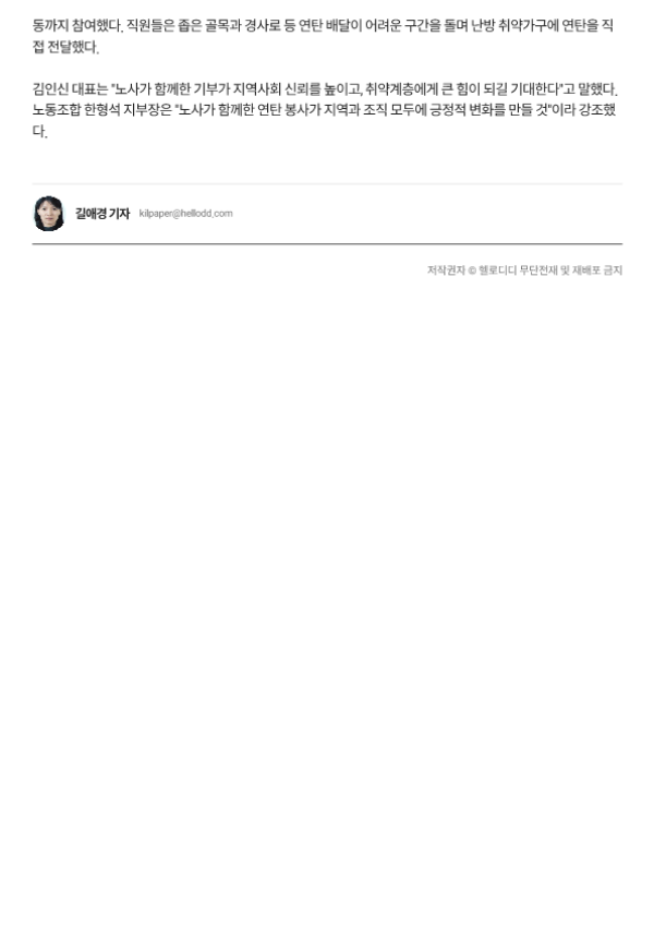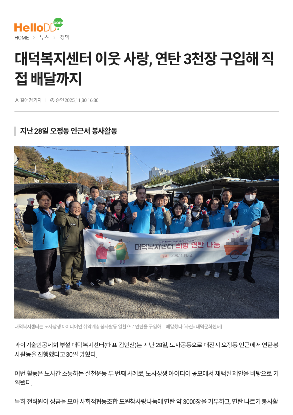 공지사항 공지사항의 작성자, 작성일, 조회수, 내용의 항목에 관한 표입니다. [보도자료] 대덕복지센터 이웃 사랑, 연탄 3천장 구입해 직접 배달까지 작성자총괄관리자 작성일2025-12-01 조회수41 목록